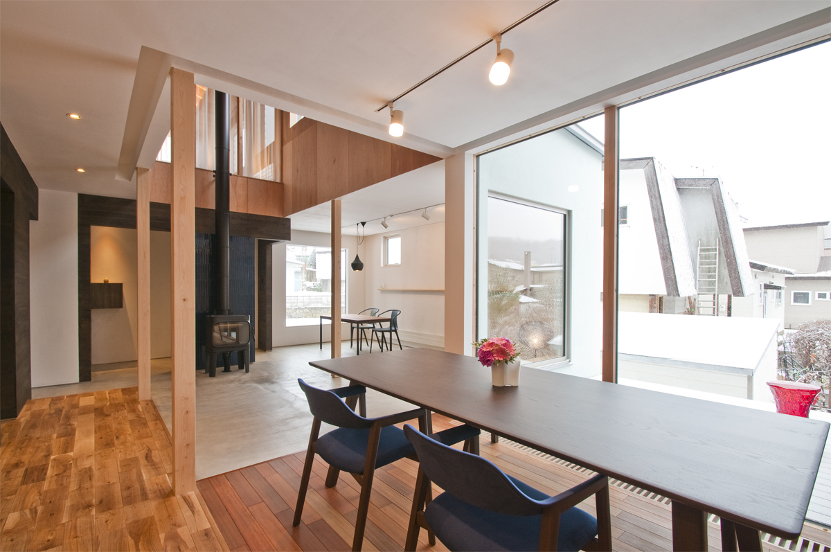 寒冷地住宅においては、大きな外部空間や広大な景色と関係を取ったり、風除室のような半外部空間によって内外の関係性を曖昧にするなど、これまで様々な興味深い試みがなされていますが、この計画では、家の中で最大限に「外」感を得られるよう、様々な仕組みを織り込むこととしました。